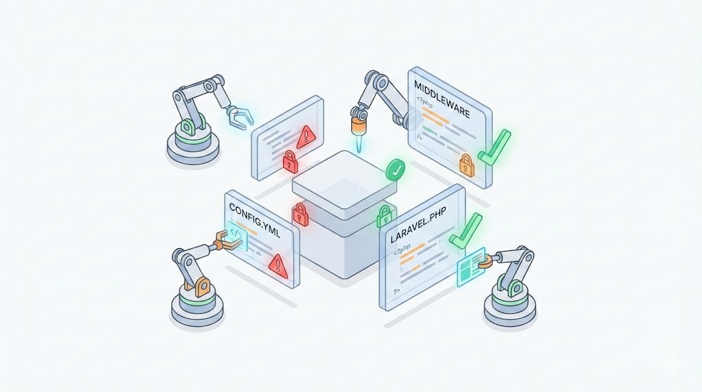 It safely updates configuration files, registers middleware, and suggests environment changes — reducing manual effort and human error.